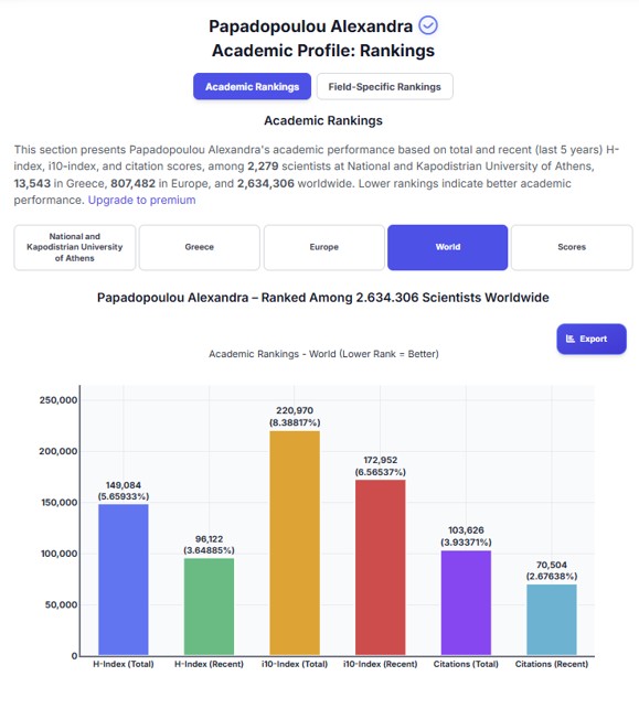 Κατάταξη στο World Scientist and University Ranking το 2026 στο 2.7% των επιστημόνων παγκοσμίως αναφορικά με τις αναφορές (citations) της τελευταίας 5ετίας και στο 3.9% παγκοσμίως αναφορικά με το συνολικό αριθμό αναφορών, στο 3.6% παγκοσμίως στον H-Index τελευταίας 5ετίας και στο 5.6% στο συνολικό H-Index. Στην Ελλάδα με βάση τις αναφορές της τελευταίας 6ετίας στην 3η θέση το 2025 ανάμεσα σε 50 διακεκριμένους Ελληνες παιδιάτρους μέλη ΔΕΠ από 9 Ιατρικές Σχολές της χώρας μας και στη 2η θέση στο Εθνικό και Καποδιστριακό Πανεπιστήμιο της Αθήνας. Οι δημοσιεύσεις μου αφορούν εξ’ ολοκλήρου την Παιδιατρική Γαστρεντερολογία, Ηπατολογία και Διατροφή και ανευρίσκονται στον παρακάτω σύνδεσμο: https://scholar.google.com/citations?user=dllhqWAAAAAJ&hl=el . Η παραπάνω κατάταξη παραμένει αμετάβλητη κατά τα 3 τελευταία χρόνια (2023, 2024 και 2025). Η αξιολόγηση είναι δυναμική: https://adscientificindex.com/scientist/papadopoulou-alexandra/4992943/